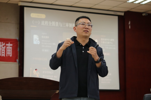 专题分享环节,王站杰以“论文送审全景解析”为主题展开专题辅导。他系统梳理了研究生论文送审的基本流程、核心标准、常见问题与修改建议,帮助在场学子厘清评审逻辑与关键细节,实现了从“知道要准备什么”到“明白怎样准备更有效”的认知提升。